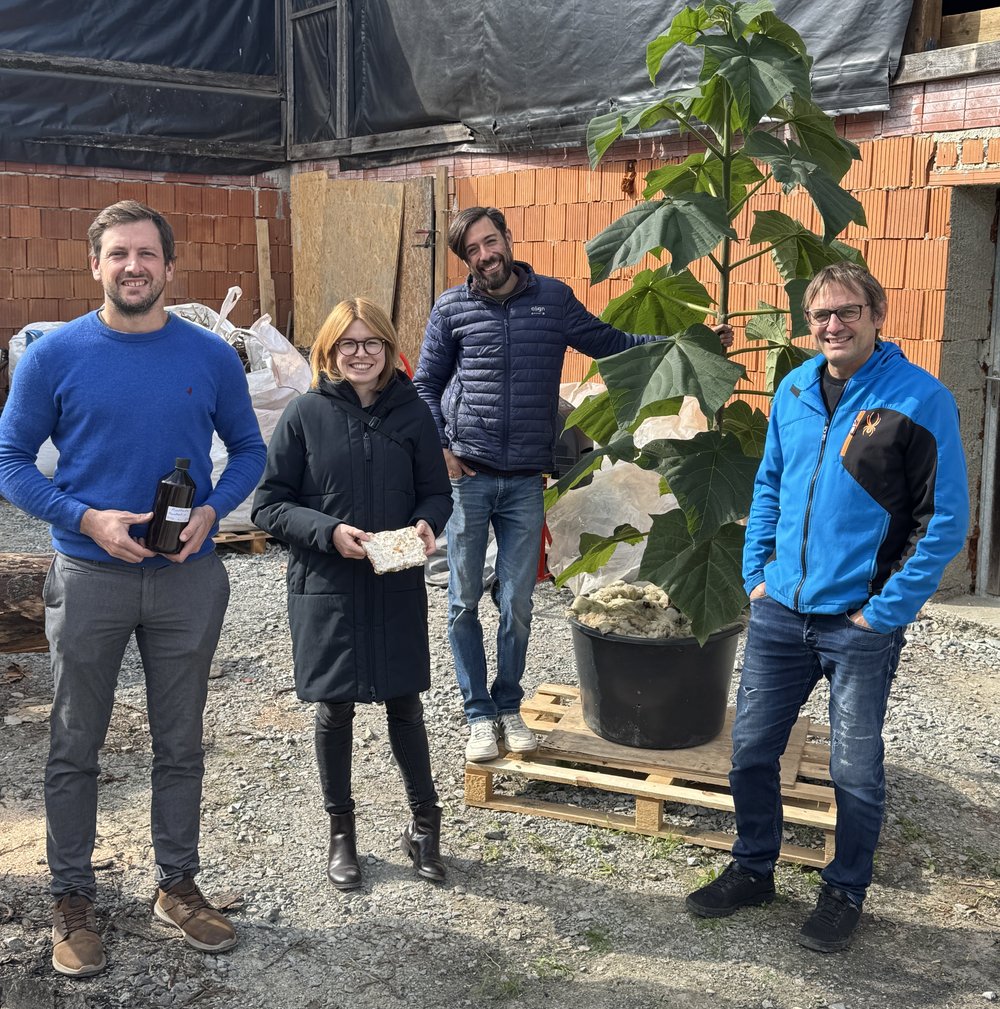 Bei ihrem Besuch informierte sich Schönberger über die beeindruckende Produktpalette des Unternehmens, die neben Paulownia-Setzlingen und -Holz auch zwei wegweisende Innovationen umfasst: die Myzelplatte und den ,Myzelbooster'. Myzel bezeichnet das unterirdische Netzwerk aus fadenförmigen Zellen von Pilzen.