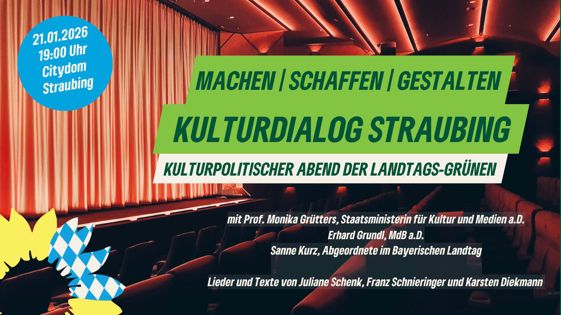 Unter dem Motto „Machen | Schaffen | Gestalten“ ist die kulturpolitische Sprecherin der Grünen Fraktion im Bayerischen Landtag, Sanne Kurz – Abgeordnete und Filmemacherin – in allen sieben bayerischen Bezirken unterwegs, um zuzuhören, zu vernetzen und gemeinsam mit Ihnen Ideen für eine starke und vielfältige Kulturszene in Bayern zu entwickeln. Die nächste Station ist Niederbayern, hier erwartet Sie eine Diskussion mit hochkarätigen Gästen!